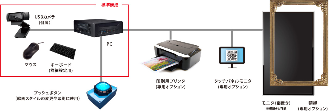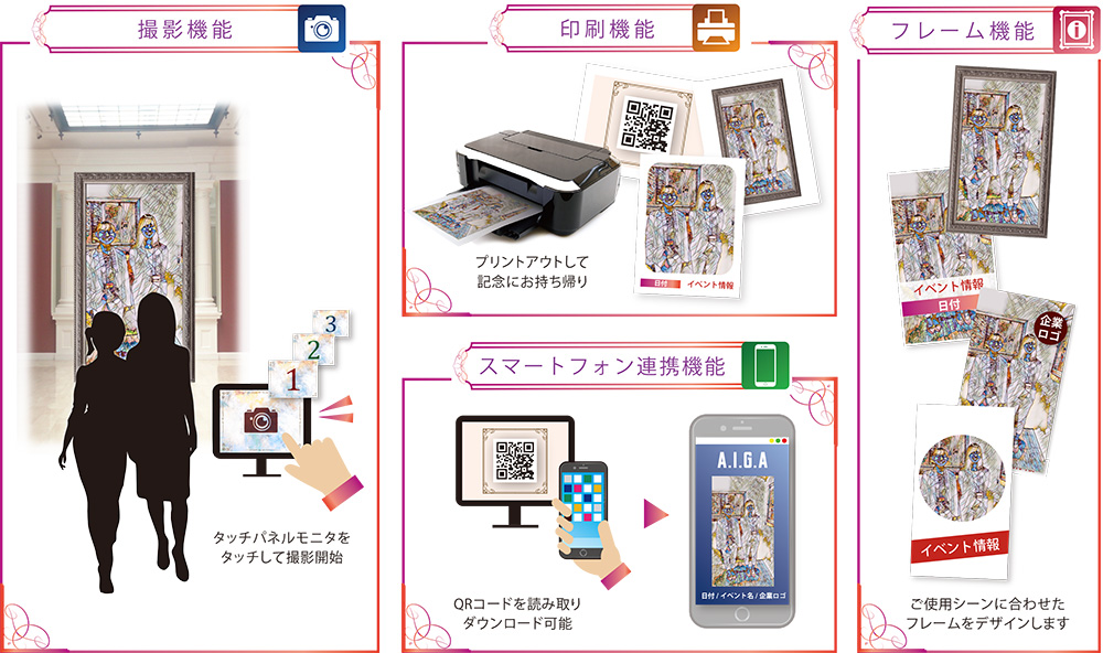 選擇喜歡的風格模版並按下按鈕進行拍攝與圖像合成。拍攝後的圖像可以經由手持設備進行QR Code二維碼讀取並下載保存。另外,也可以用專用的印表機進行列印。 此外,你還可以在圖像中添加你喜歡的相框與資訊。
